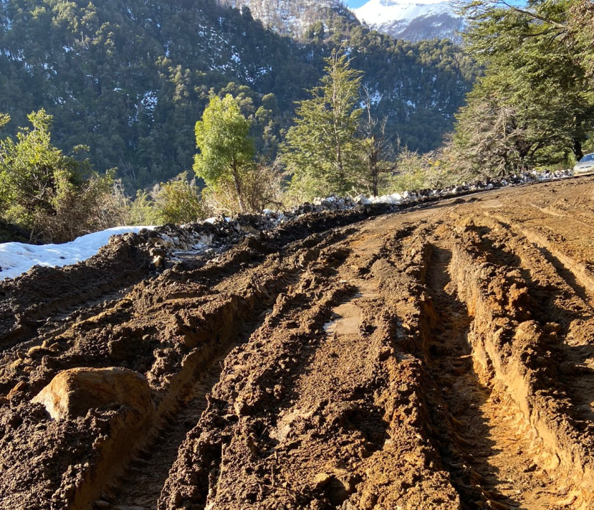 Los trabajos de movimiento de suelos se iniciaron antes del invierno y las abundantes precipitaciones de nieve ablandaron aún más el terreno. Por eso, hoy los vehículos se hunden si no circulan con cadenas. Hasta ahora, Parques Nacionales no habilitó una cantera en ese sector para poder trasladar material.