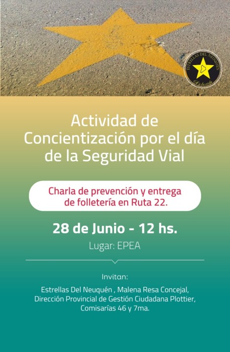 Desde el mediodía se está llevando a cabo una actividad de concientización entre Neuquén y Plottier por el día de la Seguridad Vial. Se están entregando folletos y también se realizará una charla en la EPEA de Plottier.