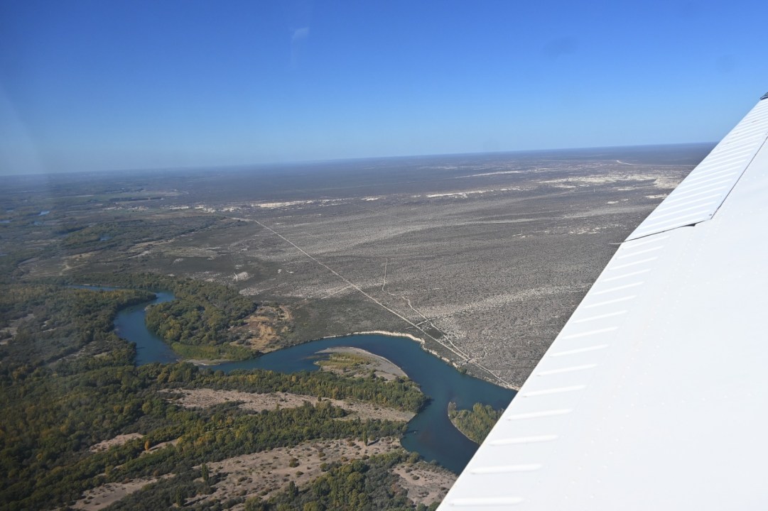 El despegue llega después de ese minucioso repaso. La pista se extiende y, en minutos, la ciudad cambia de escala. Roca se revela desde otra mirada donde pudimos visualizar sin apuro y a demanda, el intrincado recorrido del río, la geografía de los Valles de la Luna Rojo y Amarillo, y cómo el sector de chacras se va fundiendo con el área urbana de la ciudad.