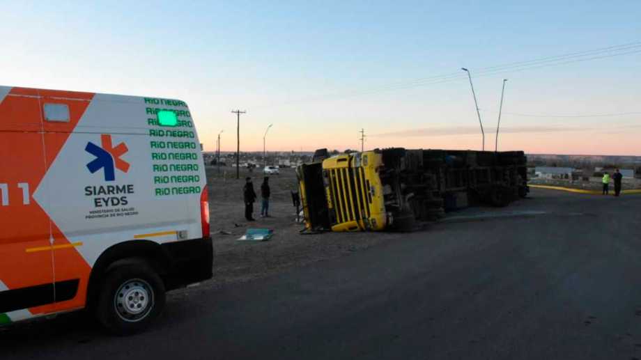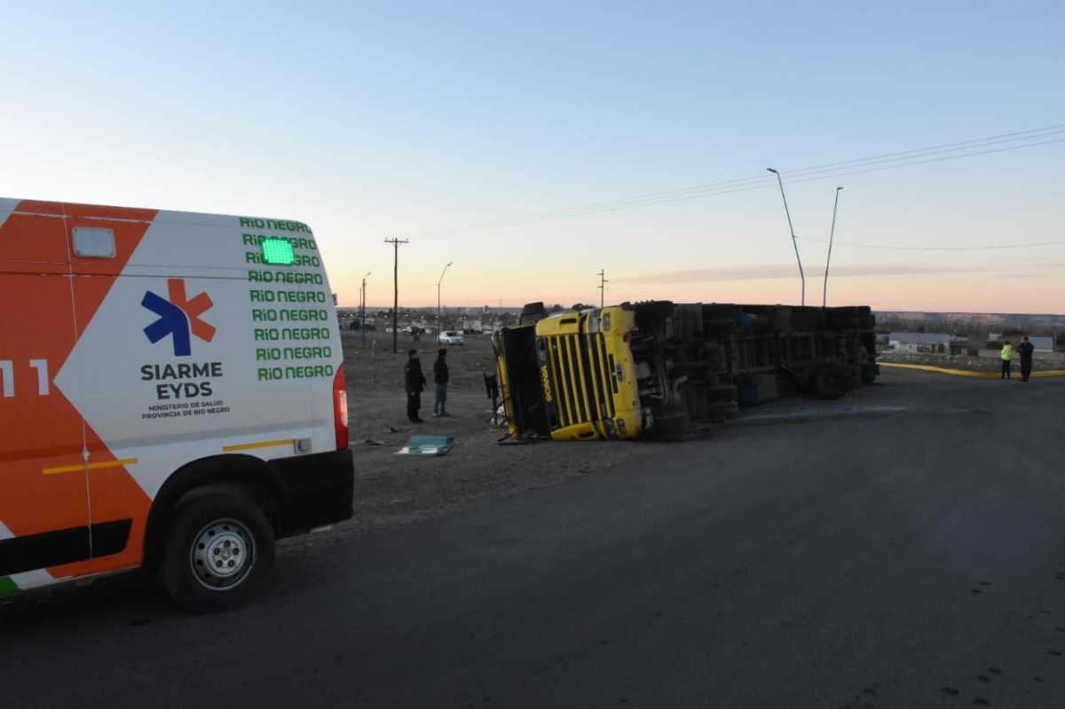 Un hombre de unos 40 años resultó con lesiones de carácter leve cuando volcó con su camión en la rotonda que une la Ruta 6 y el camino de acceso al aeropuerto de Roca. Hasta el lugar llegó personal policial, del servicio de asistencia médica Siarme y de bomberos, quienes llevan adelante tareas para contener el combustible que perdió el tanque del transporte.