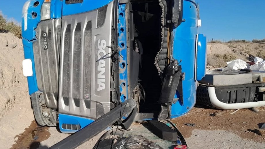 El siniestro ocurrió a la altura del kilómetro 118, en el desvío del puente de Nahuel Niyeu, donde el conductor de un Scania G380 perdió el control por motivos que se investigan y terminó con el transporte tumbado.
