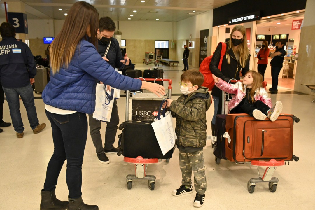 Promotoras convocadas por el Emprotur entregaron bolsas con chocolates de fabricación local a los abrigados pasajeros que cargaban sus valijas rumbo al scanner de salida, y recibían el obsequio con una sonrisa.