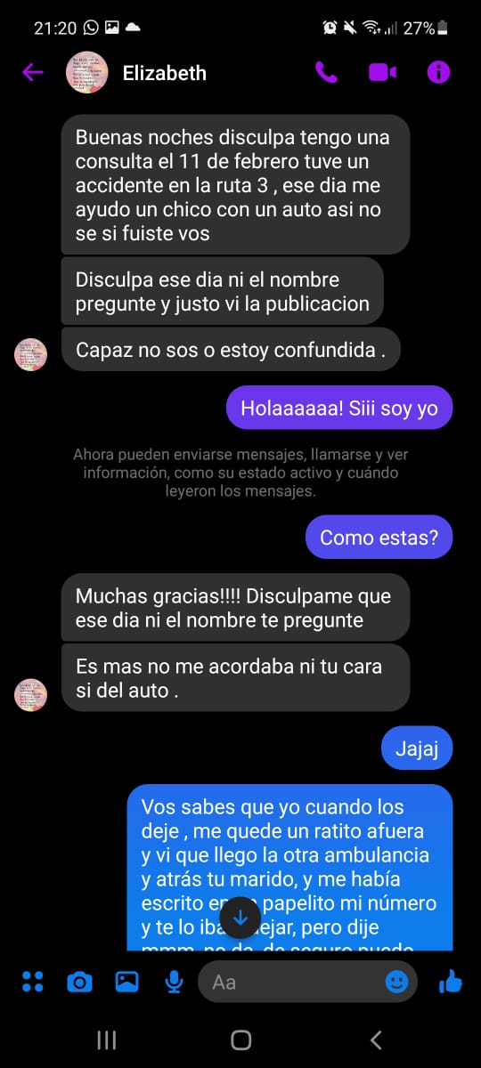 «Y a las demás personas que nos ayudaron, en juntar las cosas, llevar información, el camionero que conducía el camión de YPF que llamó a la ambulancia ya que ahí no había señal… No sé sus nombres pero recuerdo cada instante sus rostros… ¡Voy a estar siempre agradecido a todos ustedes!», agrega.