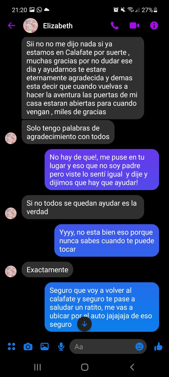 “Salieron a buscarnos con una silla de ruedas y Maxi les explicó el cuadro y entonces vinieron con una camilla. También se hizo cargo de eso. Después nos atendieron y no lo vi más. Ahora sé su nombre porque ese día ni se lo pregunté y tampoco me acordaba de la cara por los nervios. Pero sí del del auto: cuando vi en el diario Río Negro la nota de su viaje a Ushuaia lo reconocí y le escribí por Messenger para agradecerle por todo lo que hizo”, agregó Eliana.
