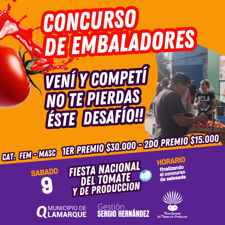 La grilla también incluye concursos, que tendrán importantes premios. El sábado a partir de las 17′ habrá una ‘salseada’, para definir cuál será la mejor receta. Luego se hará el concurso de embaladores. El domingo, en tanto, será el turno de la tomatina, que será a las 15′.