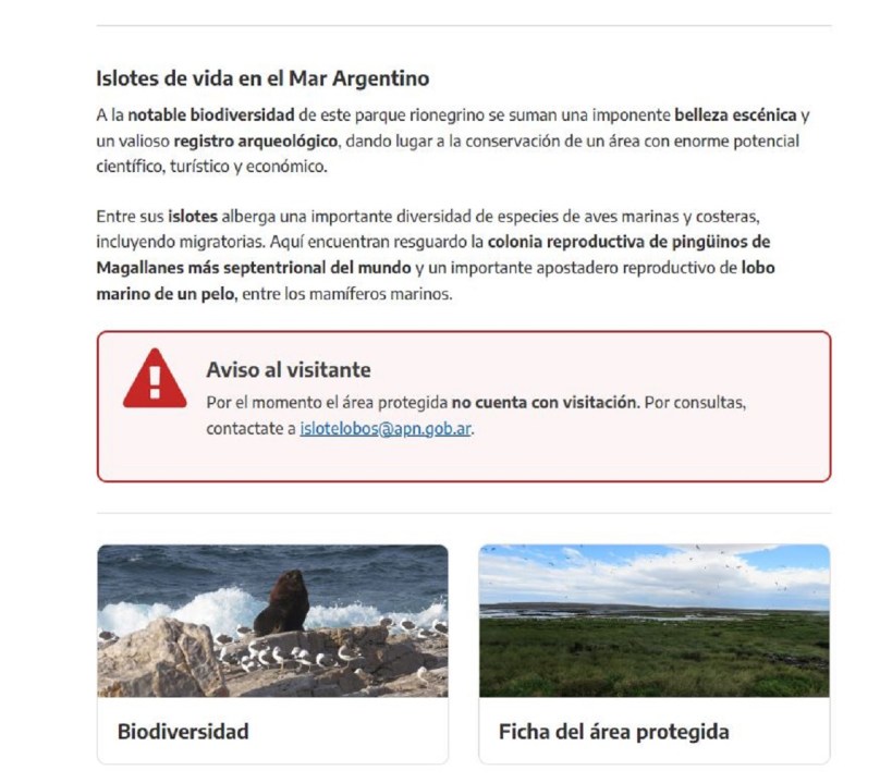 “Aviso al visitante: Por el momento el área protegida no cuenta con ‘visitación’. Por consultas, contactate a islotelobos@apn.gob.ar”.