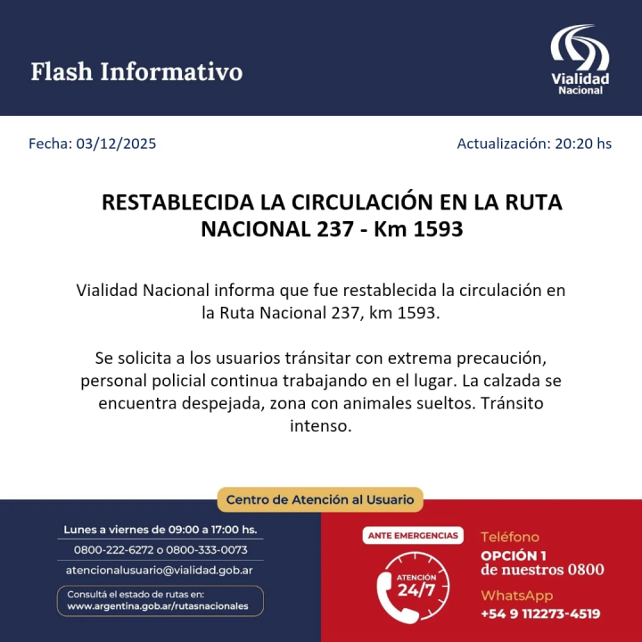Desde Vialidad Nacional recomendaron extremar la precaución al transitar por la zona, especialmente por la presencia de serranías, curvas y la alta afluencia de vehículos en horarios de la tarde.