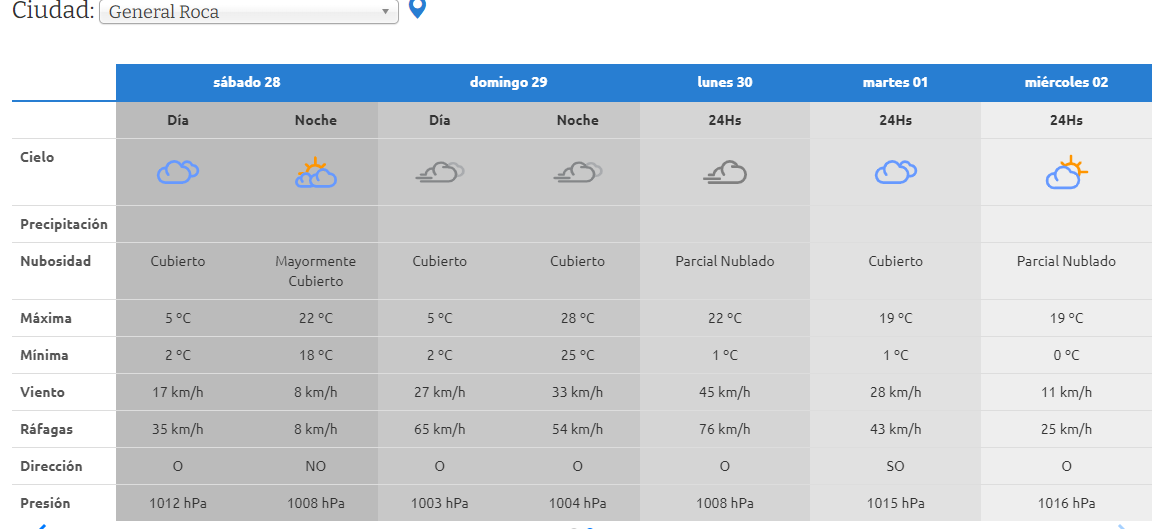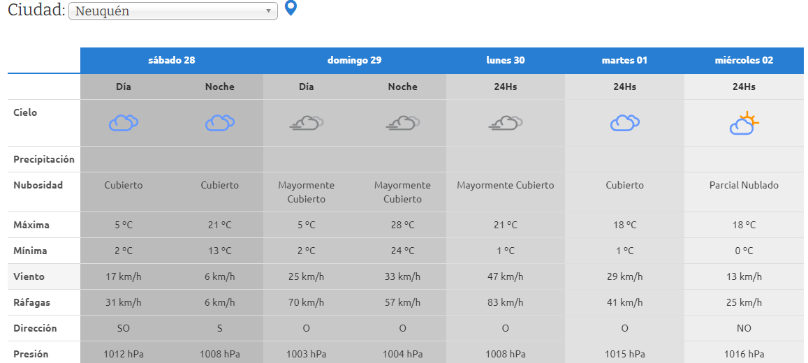 Desde la AIC, indicaron que en Neuquén capital las ráfagas alcanzarán los 70 km/h el domingo durante el día y de 57km/h en la noche. El lunes se intensificará a 83km/h. En Roca, el 30 de septiembre se esperan ráfagas de 76 km/h y en Villa Regina de 72km/h.