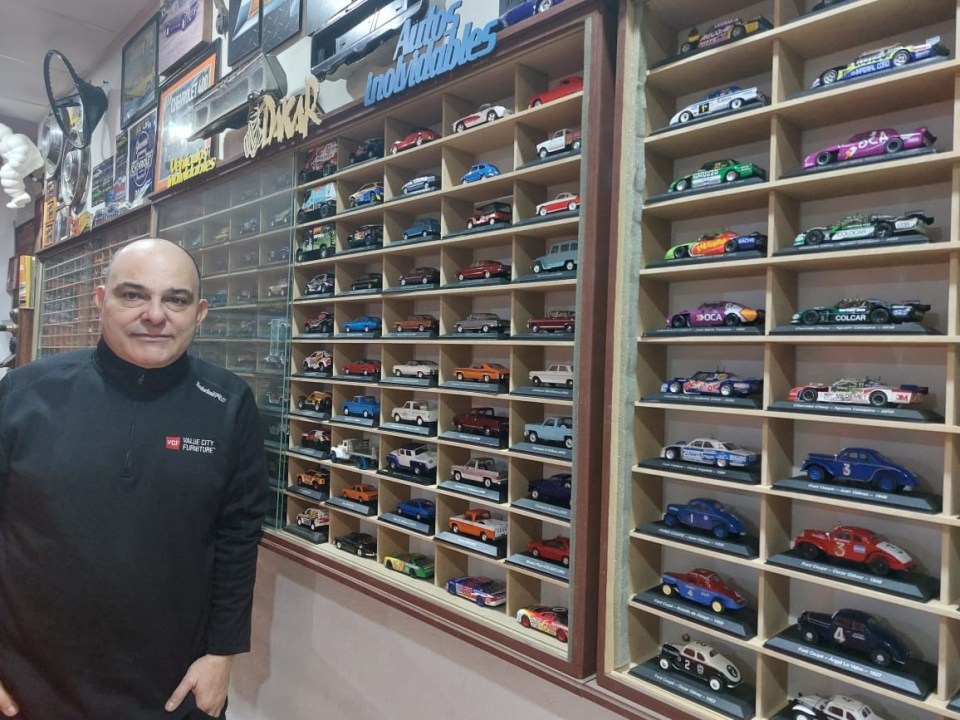 Todos los autos en miniatura del Turismo Carretera, del rally Dakar y muchos de la Fórmula 1 lucen en sus vitrinas. De niño le gustaba hacerlos chocar y romperlos. Ahora los atesora.
