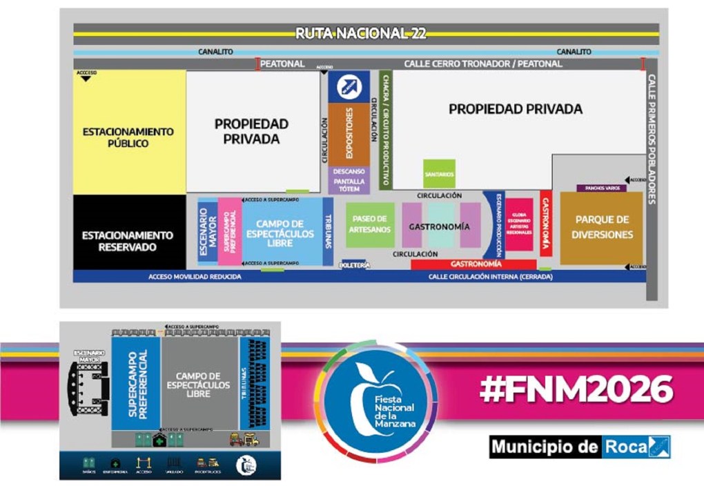 Desde la organización de la Fiesta de la Manzana 2025 en Roca indicaron que lo accesos al predio serán por las calle Tronador (parte frontal) y Primeros Pobladores (parte lateral).