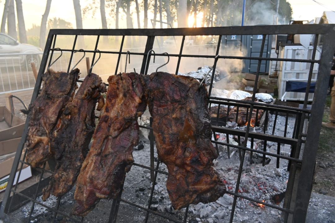 A medida que oscurecía, los puestos gastronómicos humeaban y comenzaron a perfumar el lugar con aroma a carne asada y hamburguesas. “Estamos en Parrilla El Vasco, acá vamos a ofrecer sándwiches de bondiola, vacío y choripán; tenemos bebidas frescas. Somos trece trabajando juntos”, decía uno de ellos. A su lado, el parrillero agregaba: “Hoy vamos a hacer 150 kilos de carne y creemos que se van a vender. Hay muy buena energía y onda con los puestos cercanos. La vamos a pasar muy bien”.