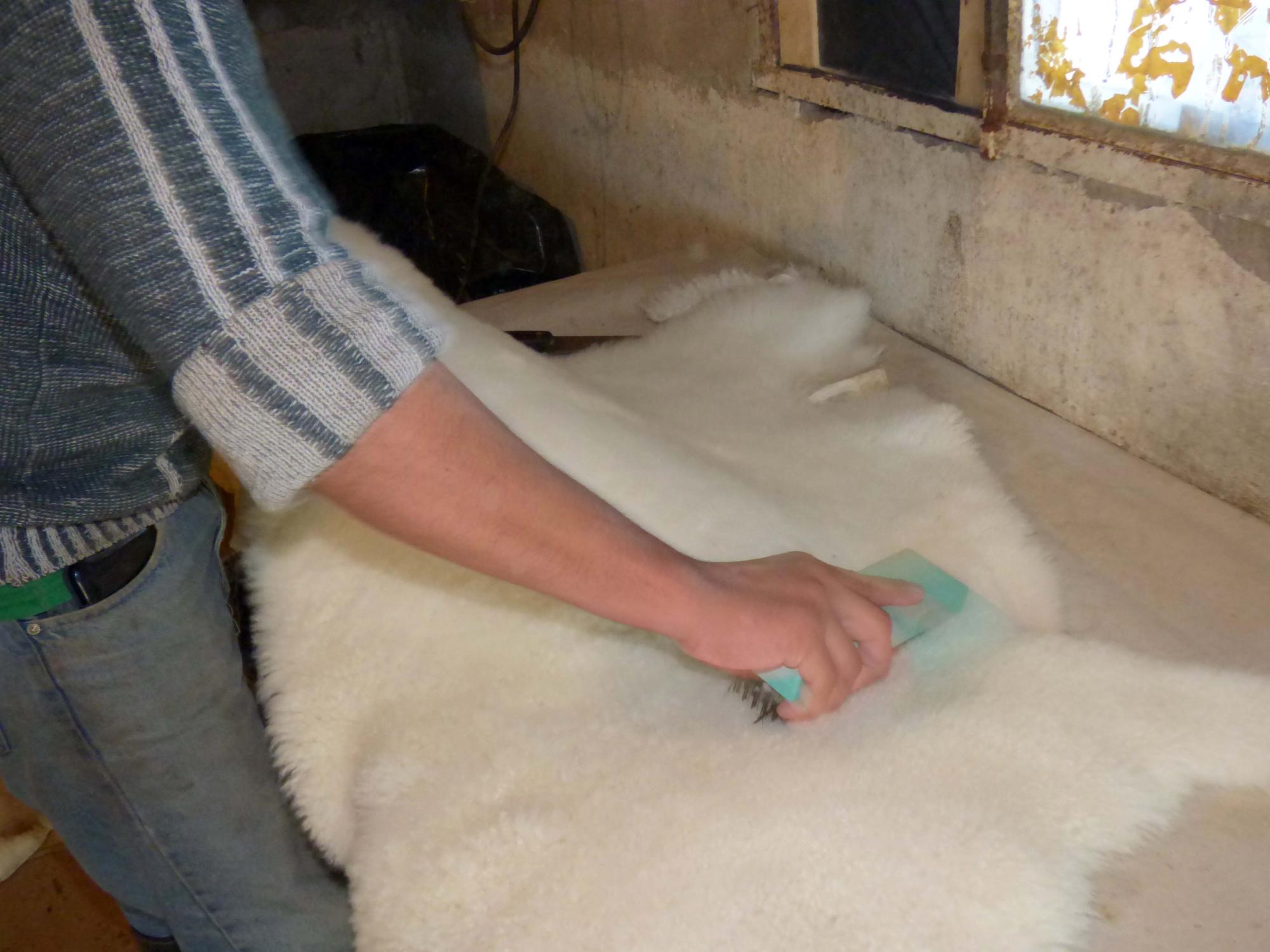 - Finalmente se hace un desorillado del cuero, sacando todo sobrante en las orillas, y se pasa un cepillo de acero de mano dejando totalmente limpio el pelo o la lana.