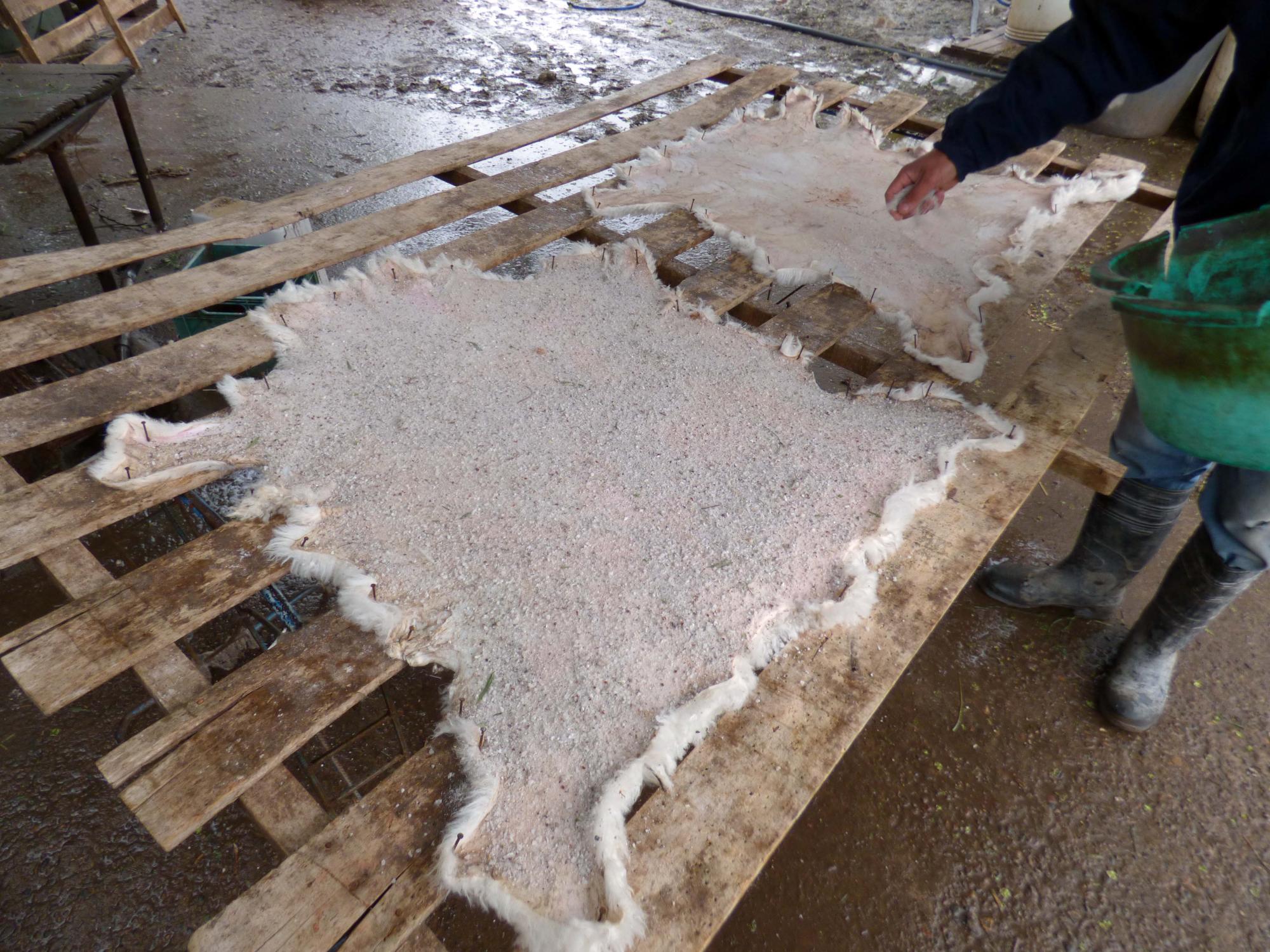 - Se deja escurrir y se procede al estaqueado en hormas, dejándolo bien estirado. Entonces se distribuye una mezcla de alumbre y sal en todo el cuero.
