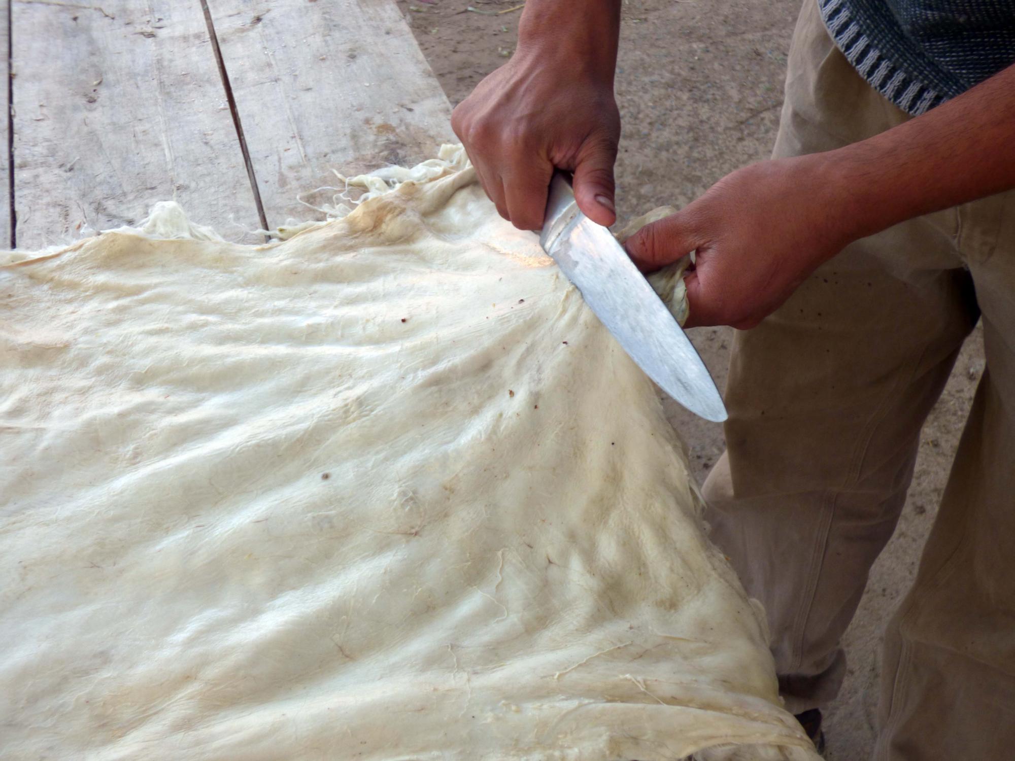 - Se descarna el cuero con un cuchillo, quitándole toda la grasa o sobrante de carne que pueda tener.