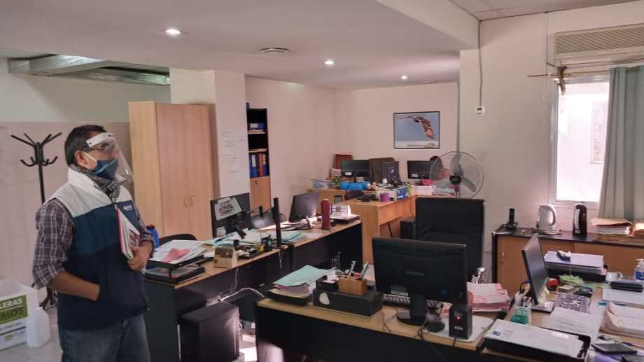 Los trabajadores que fueron convocados para cumplir guardias mínimas previeron el distanciamiento entre los escritorios que se ocupan, pero no hay nadie que controle y exija el uso de barbijo cuando no se guarda el distanciamiento social preventivo.