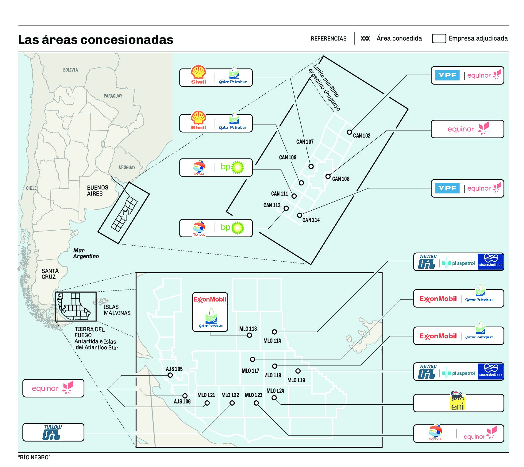 Con tres bloques las sigue la compañía francesa Total, con operaciones en el offshore argentino, la gigante norteamericana ExxonMobil y la firma que desató la presentación del recurso de amparo que tramita en la justicia federal, la inglesa Tullow que en un área se encontrará sin socios. En tanto que con dos bloques se ubican la angloholandesa Shell, la alemana Wintershall DEA, y la inglesa BP.
