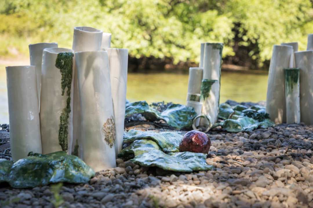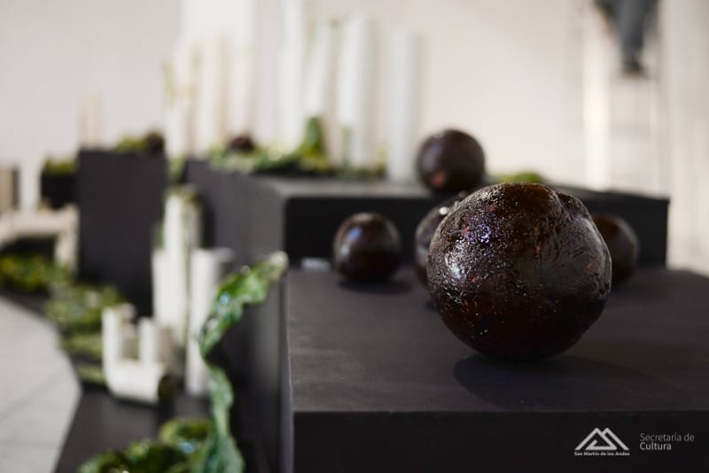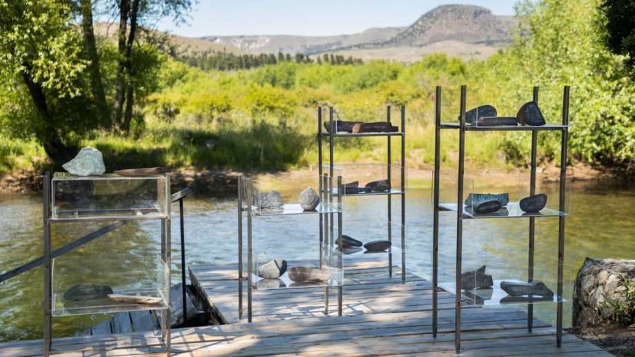 “Las Piedras grabadas nos remiten a lo perdurable, silencio de milenios, secretos del cosmos con piedras filosofales que son luces en nuestro camino. De los Tubos de Viento, en el entorno acuoso de los musgos, brotan sonidos. Nos recuerdan la importancia del respirar de la vida. El Árbol de la Abundancia renace en un espacio de arte en donde todo es posible. Trae su vitalidad y sus colores en medio de la austeridad de la precordillera. La Medusa es una raíz en el río Chimehuin. Su nombre viene de su parecido con la cabeza de Gorgona, la Medusa, que transformaba en piedra a todos los humanos que le miraran la cara. Perseo, el hijo de Dánae, tuvo por misión terminar con ella, pero nosotros la quisimos domar y con nuestras intervenciones se convirtió en una medusa sanadora”, explicaron las artistas sobre la muestra.