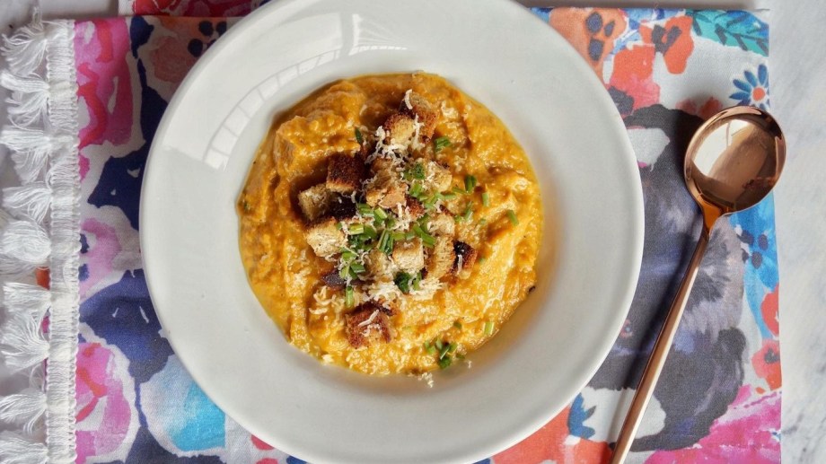 Para esta receta también se pueden usar zanahorias comunes. Entonces en una fuente colocamos un poco de aceite de oliva, las zanahorias y las caramelizamos (ponemos pimienta, azúcar). En una olla poner aceite de oliva y agregamos verdeo morrón, cebollas en escamas, ajo granulado pimienta, doramos y agregamos sal y las zanahorias caramelizadas. Revolvemos y a fuego bajo agregamos el caldo. Cuando se consume bastante agregamos la leche y dejamos que cocine un ratito. Una vez lista la colocamos en un bol y la mixeamos. Después solo servimos. Le pueden poner crutones y queso rallado por arriba.