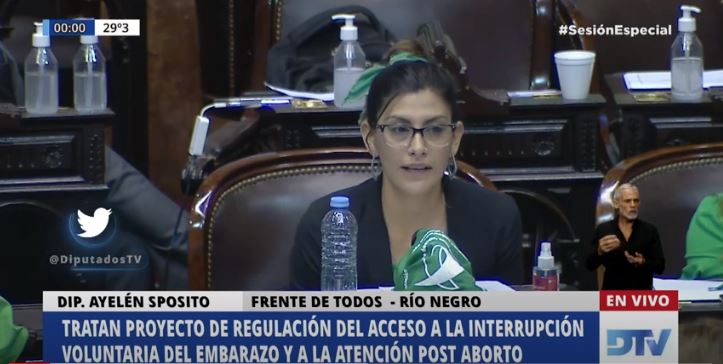 «Hoy estoy aquí, sentada en esta banca y voy a defender este proyecto. Lo voy a defender no solo como médica sino como una militante transfeminista«, aseguró la diputada de Río Negro, Ayelén Spósito (Frente de Todos).