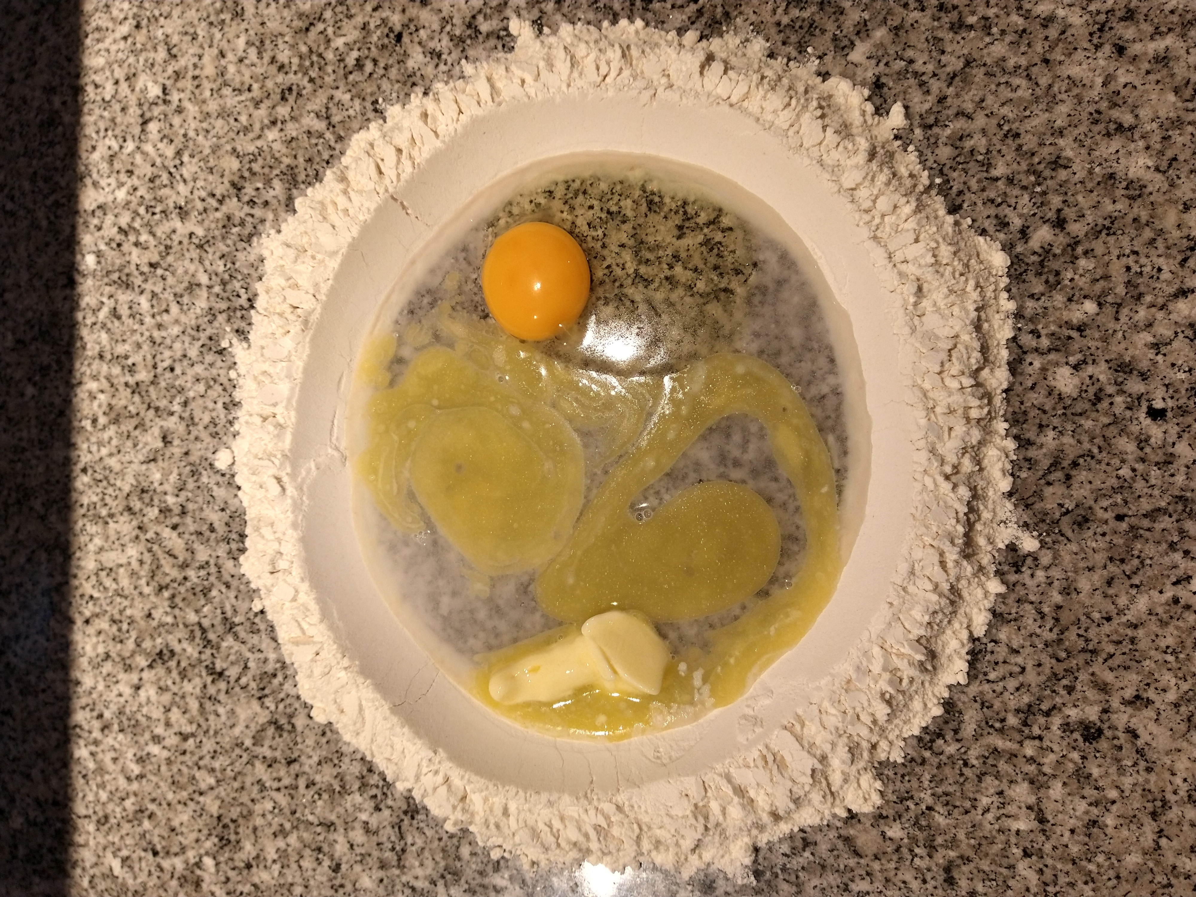 Realizar una corona con el harina y la sal fina. En el centro colocar el huevo, agua tibia y la manteca derretida. Comenzar a amasar hasta lograr una buena masa lisa y homogénea. Colocar en un bowl y dejar descansar por 1 hora, tapada.