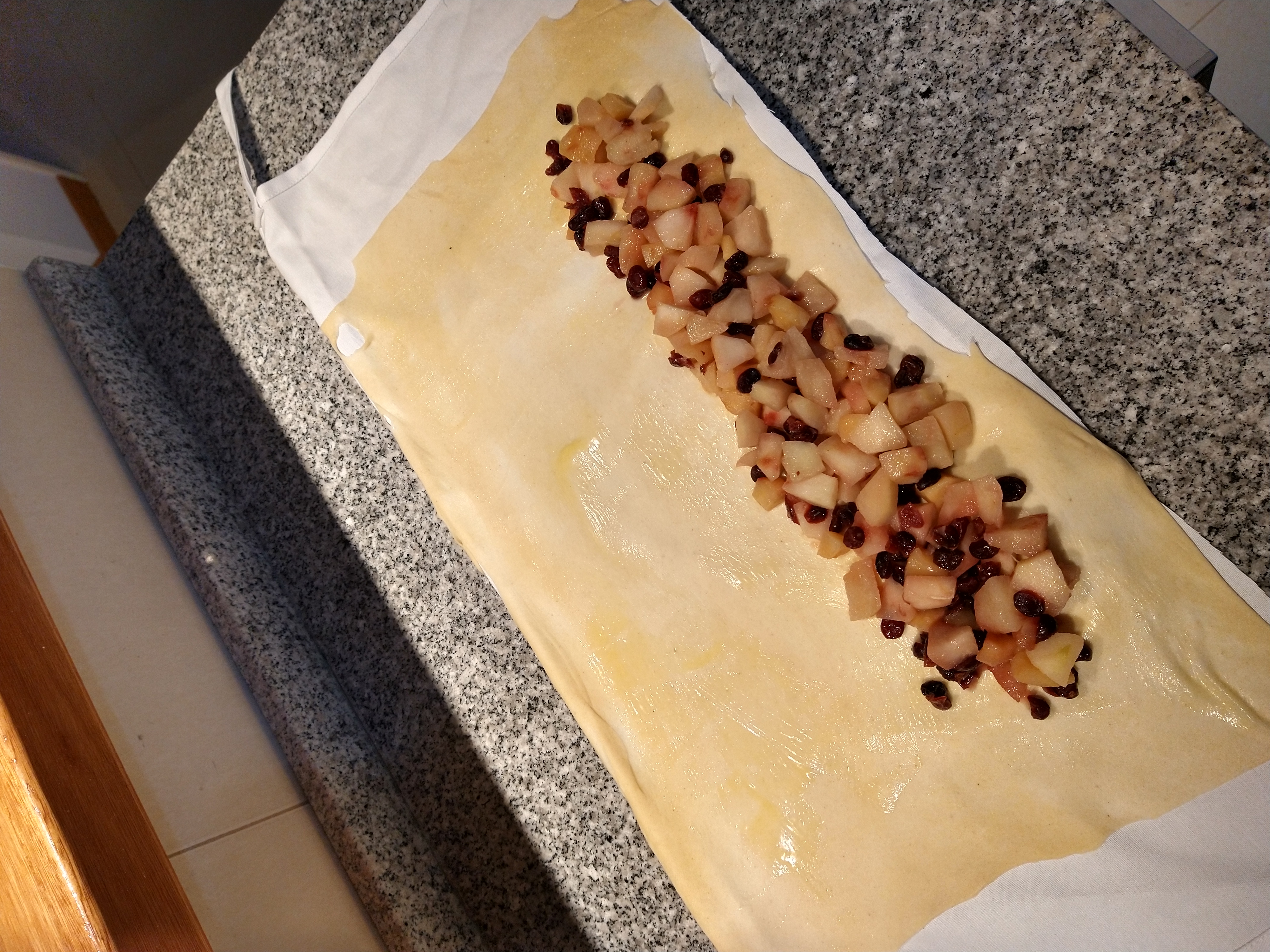 Doblar los extremos hacia adentro y comenzar a enrollar. Colocar el strudel crudo sobre una placa engrasada (manteca, aceite o rocío vegetal) y pincelar por encima con manteca derretida.