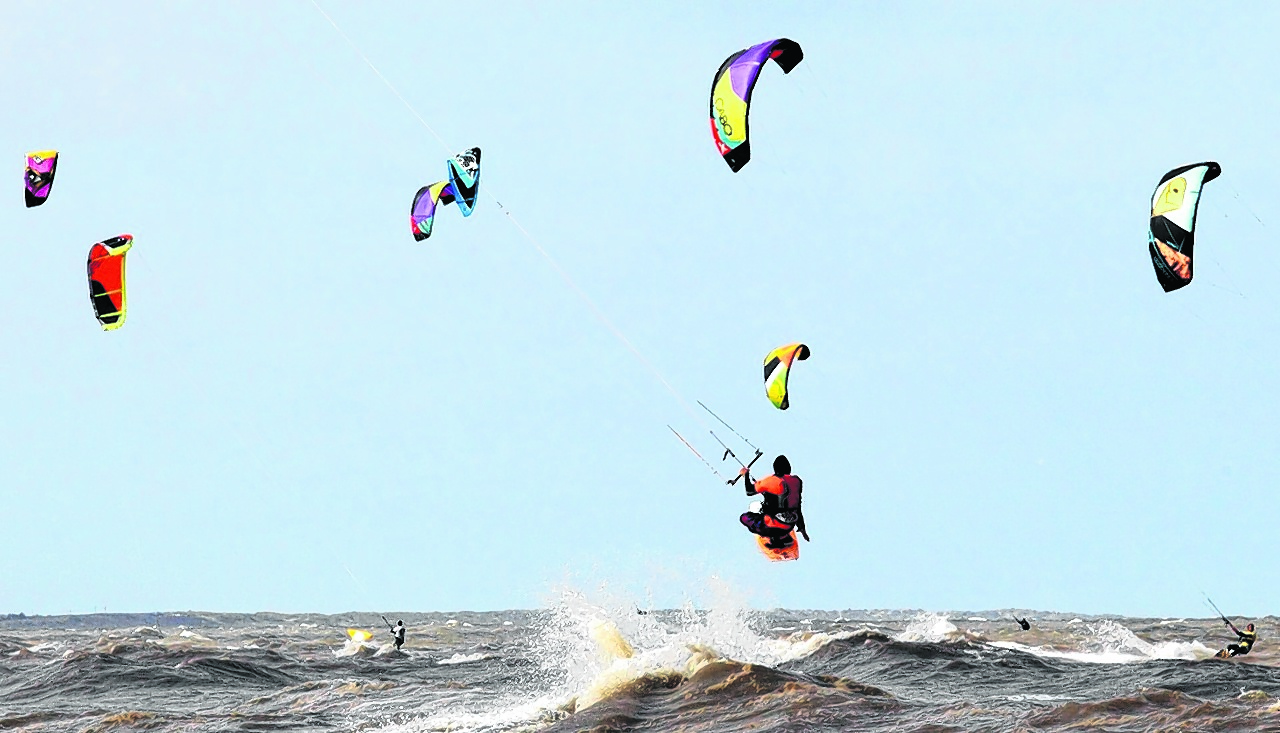 Para practicar kitesurf, solo se puede ir a un lugar habilitado cerca de La Boca. Allí las ráfagas marítimas y las olas ponen a prueba la fuerza, resistencia y coordinación. Es un parque de viento en que conviven con los que hacen carrovelismo en coches con velas, que se desplazan sobre la playa.