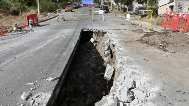 Sociedad Se hundió un tramo del asfalto y quedó un enorme socavón en una calle céntrica de Bariloche Un antiguo pluvial colapsó por una filtración de aguas subterráneas y causó el desmoronamiento en ese lugar. El municipio prohibió el tránsito vehicular por ese sector. Estimaron que la reparación demandará varias semanas. Por Redacción