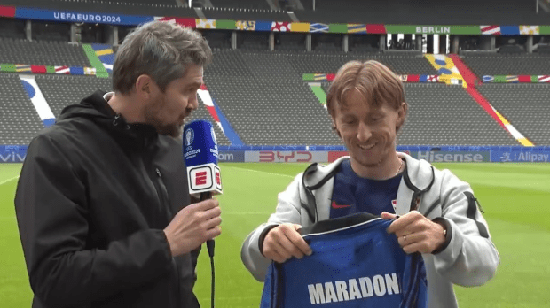 Deportes Eurocopa: Modric se emocionó al recibir de regalo una camiseta de Maradona El capitán de la selección croata expresó su devoción por el astro argentino. Mirá el video. Por Redacción