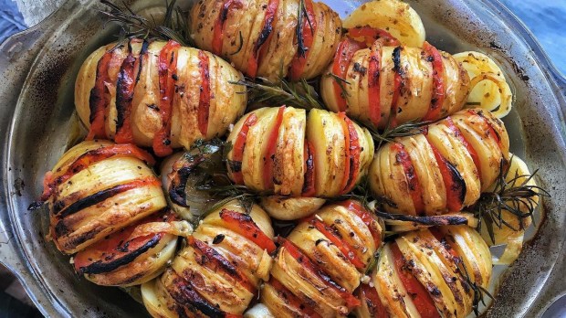 Recetas Sabor concentrado en estas papas hasselback Un plato muy fácil de hacer que puede ser tanto principal como guarnición. La sugerencia es de Claudia Romero (@amasa.madre). Por Redacción