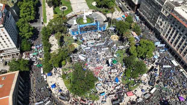 Política El Gobierno le restó importancia a la marcha de la CGT en contra de la reforma laboral El Ejecutivo minimizó la protesta que se convocó este jueves en Plaza de Mayo a la cual acudieron importantes columnas sindicales. Por Redacción