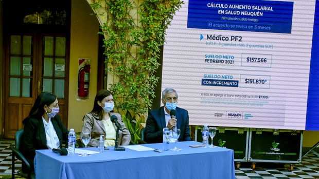 Región El gobierno de Neuquén pagará 30 mil pesos de bono, pero los cortes de Salud se mantienen En conferencia de prensa el ministro Guillermo Pons (Economía) y las ministras Vanina Merlo (Gobierno) y Andrea Peve (Salud) confirmaron que "la asignación covid" será efectivizada por un decreto del gobernador. Por Redacción