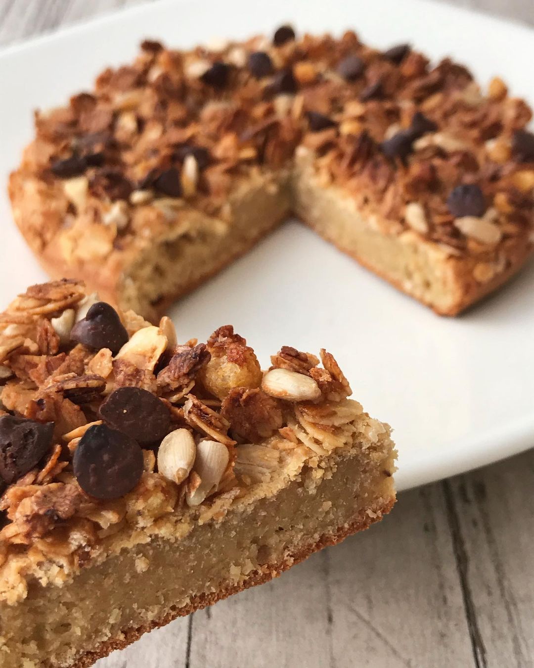 Licuar todo menos la granola y los chips. Si queda con consistencia semi líquida agregar más avena. Colocar la preparación en un molde chico y llevar al horno 15 minutos o hasta que pinchando el cuchillo salga seco. Agregar por encima unos minutos antes la granola para que se torne crocante y al final los chips.
