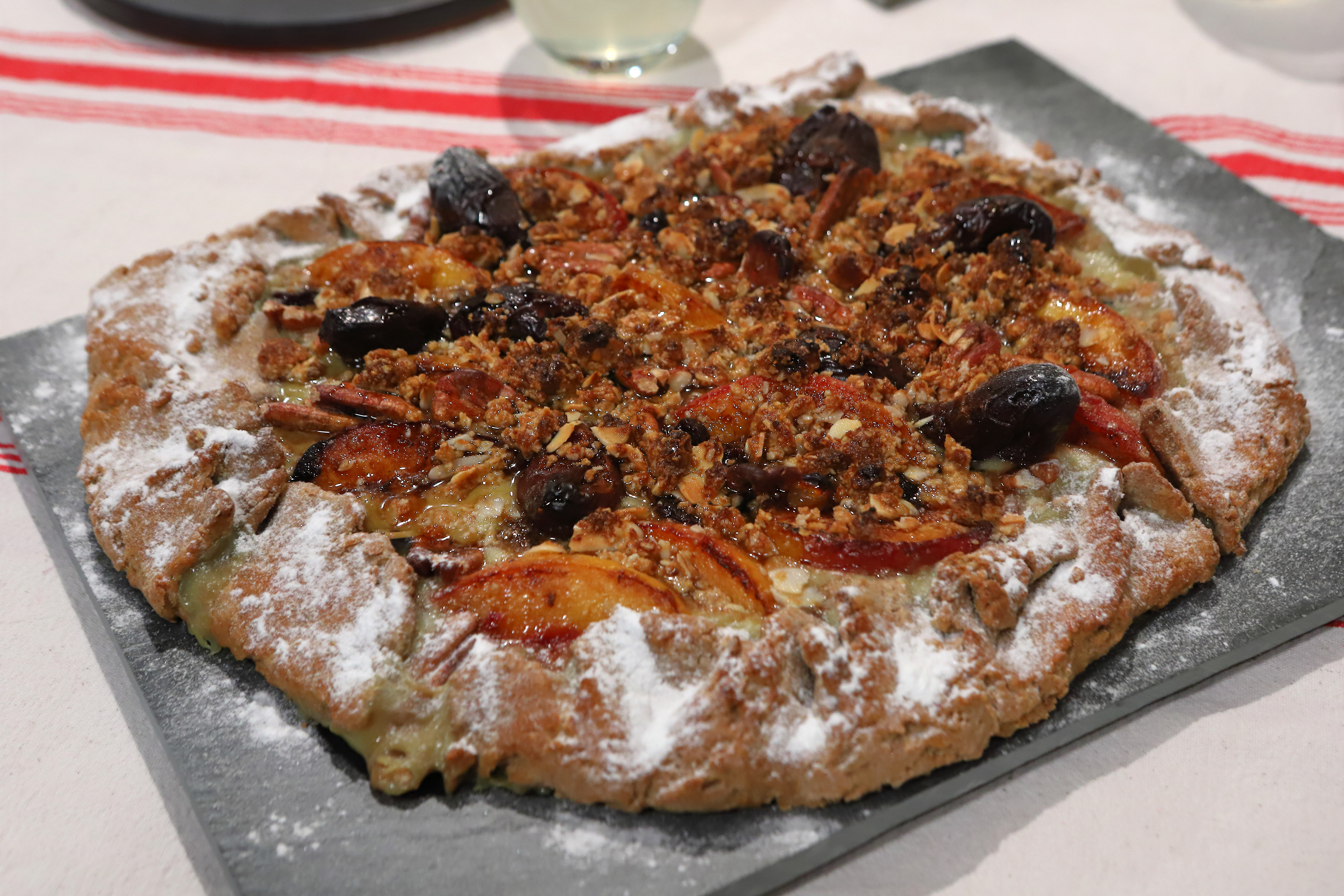 3- Agregar los duraznos dorados y por encima las pasas, nueces pecan, dátiles sin carozo y plegar los bordes de la masa hacia adentro de manera rústica.