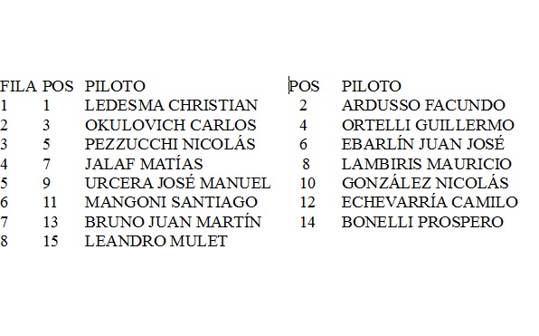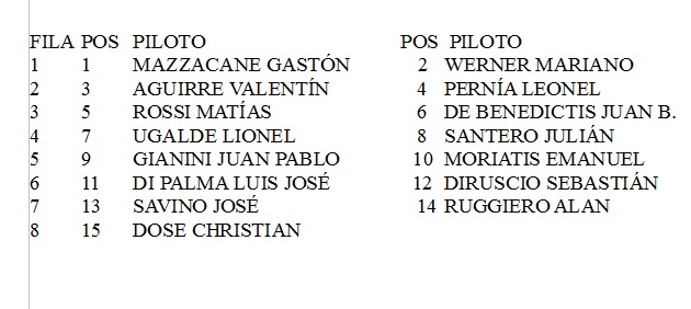 Las series están encabezadas por Gastón Mazzacane (Chevrolet) quien logró la pole position en la clasificación general y estará largando desde el primer cajón de la serie que iniciará las competencias del domingo.