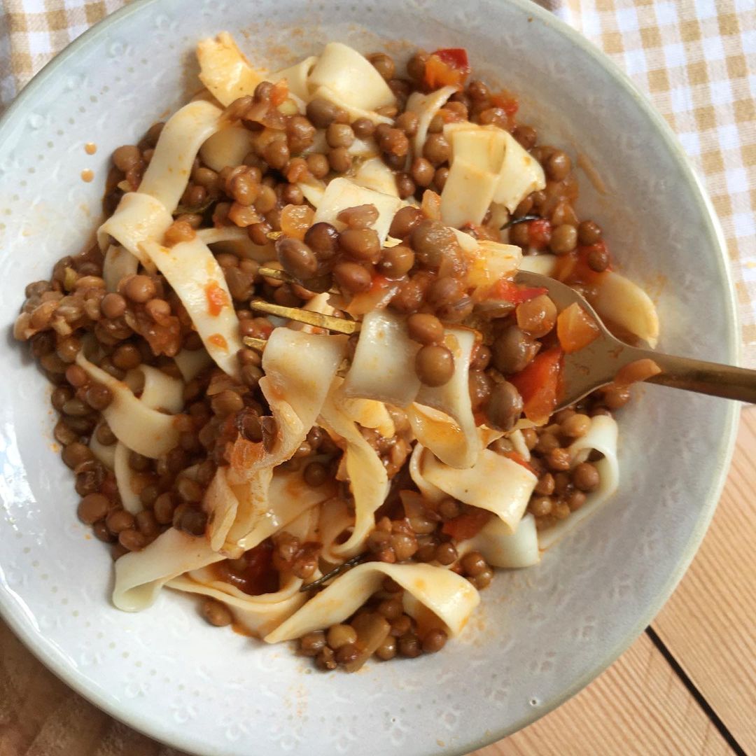 Picamos 1 cebolla y 1/2 morrón rojo, comenzamos a saltearlos en una sartén con aceite de oliva. Una vez que empiezan a ablandar agregamos 1/2 zanahoria rallada, 300 g de puré de tomate y 100 cc de agua. Condimentamos: yo usé polvo de ajo, orégano, sal, apenas pimienta. Finalmente agregamos 300 g de lentejas cocidas y dejamos que todo se cocine a fuego medio/bajo por 30 minutos.