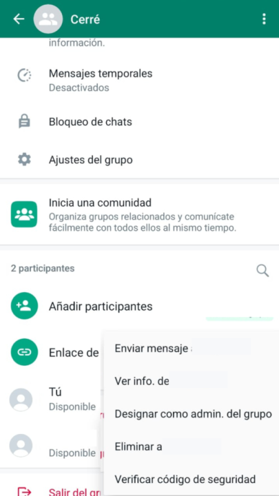 5.Cuando vayas a la descripción del grupo, mantené presionado sobre el contacto que agregaste hasta que aparezca un menú al costado. Entre esas opciones, va a estar disponible “Eliminar a (nombre del contacto)”