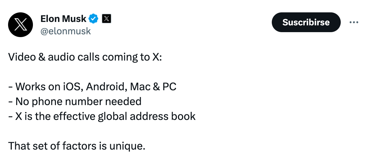 “Video llamadas y audio están llegando a X”, publicó Musk ayer. “Funcionará para iOS, Android, Mac y PCs”, detalló el empresario sobre la disponibilidad técnica requerida.