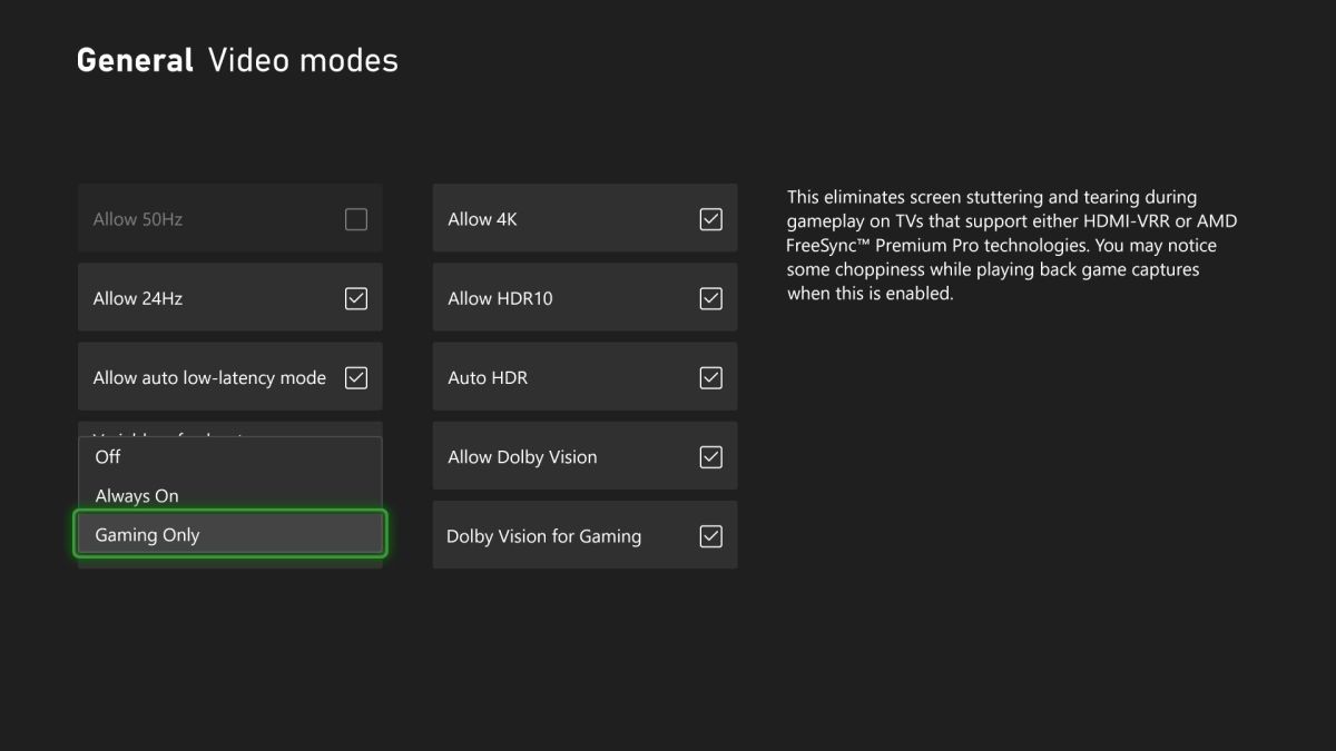 La actualización de frecuencia de actualización variable, para consolas Xbox Series X|S, permite optar por habilitar VRR sólo cuando estás en modo juego o siempre activo. Esto mejora la experiencia en aplicaciones de entretenimientos que no siempre funcionan bien con VRR.