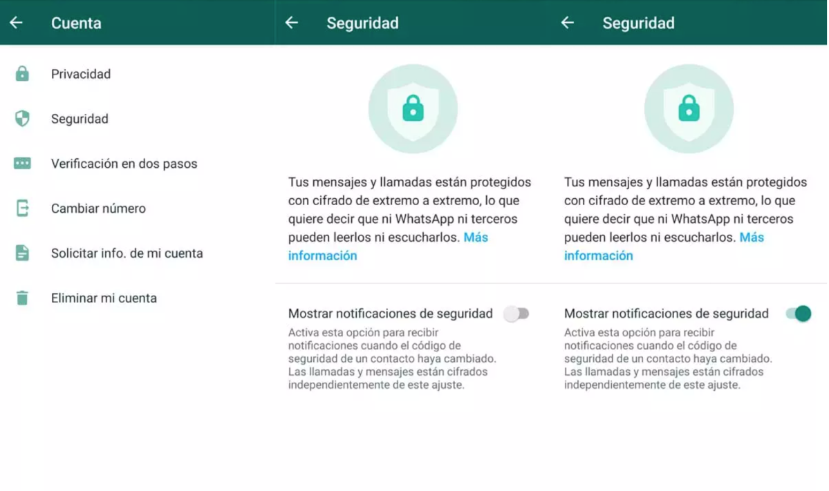 WhatsApp tiene por defecto las conversaciones cifradas de punta a punta. Esto significa que están codificadas y si hay una interferencia o un nuevo dispositivo accede a ese chat, la aplicación puede detectarlo y enviarnos una notificación. Para que esto último ocurra, es fundamental tener activada esa opción: