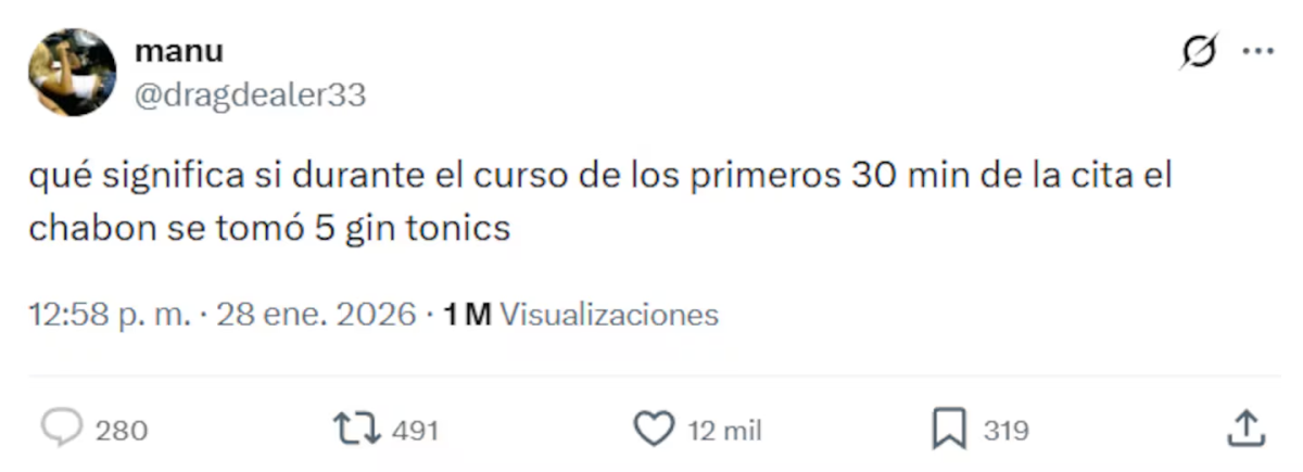 En este marco, el tema se volvió viral en redes sociales a partir de un tuit que despertó debate y miles de interacciones: “¿Qué significa si durante los primeros 30 minutos de la cita el chabón se tomó cinco gin tonics?”. La pregunta abrió una conversación colectiva sobre límites, expectativas y señales tempranas en los vínculos.