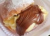 Entonces dejar enfriar los profiteroles, cortarlos, rellenar con la crema pastelera y bañarlos con chocolate semiamargo derretido y chocolate blanco.