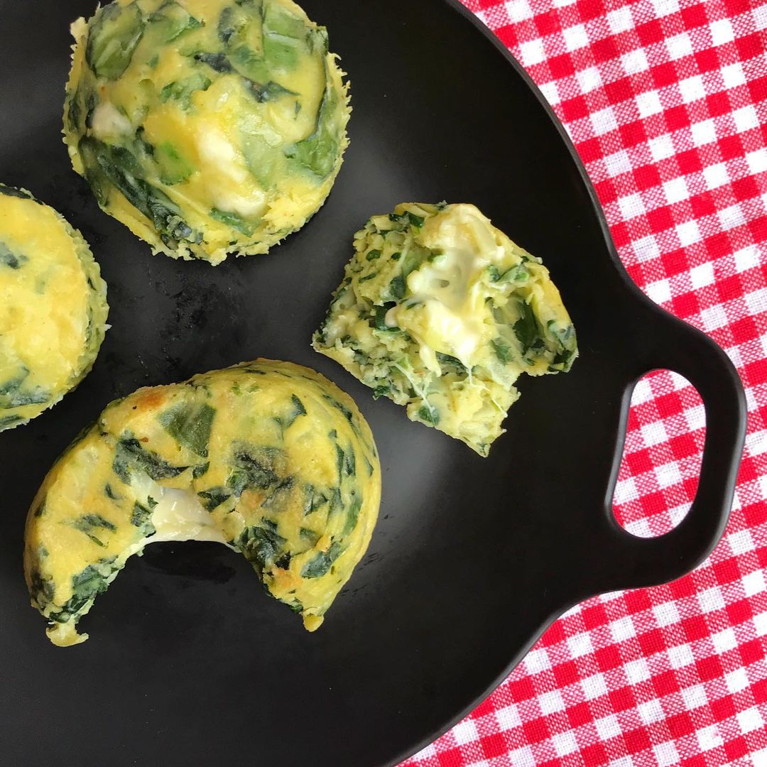 Comenzamos salteando 1 atado de espinaca picado con 1 cebolla picada hasta que esté todo bien cocido. En un bol batimos 2 huevos con 1 cucharada de queso crema, 2 cucharadas de queso rallado y 2 cucharadas de leche. Agregamos las verduras a la mezcla anterior e incorporamos 4 cucharadas de harina. Aceitamos moldes de muffins y colocamos 1 cucharada de la preparación, luego 1 cubito de queso muzzarella y cubrimos con más preparación. Los cocinamos en horno medio 180/200° C por 20 minutos.
