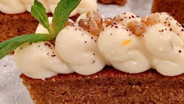 Para las barritas: Mezclar la zanahoria rallada fina con los huevos, el aceite y esencia de vainilla y el ron. Agregar ralladura de naranja el azúcar blanca y rubia. Incorporar la harina, canela, con el polvo de hornear y el bicarbonato. Mezclar hasta unir bien. Colocar en un molde en mantecado y en harinado. Cocinar en horno precalentado a 160° C por 35 minutos.