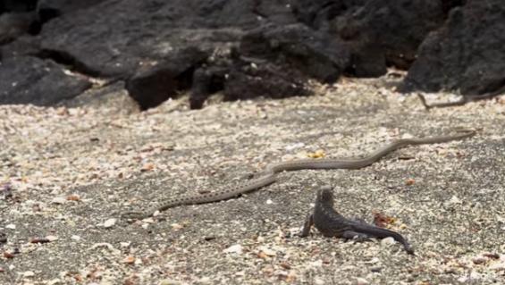 Una iguana, un grupo de serpientes y un comportamiento como nunca antes se había filmado, en un trabajo de la BBC.