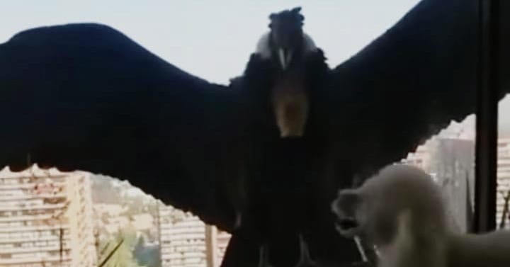 En un departamento en Santiago de Chile apareció un cóndor en el balcón y del otro lado del ventanal un perrito le salió al cruce. Después aparecieron otro cóndor y otros dos perritos. Mirá como siguió el duelo en este video que se hizo viral.