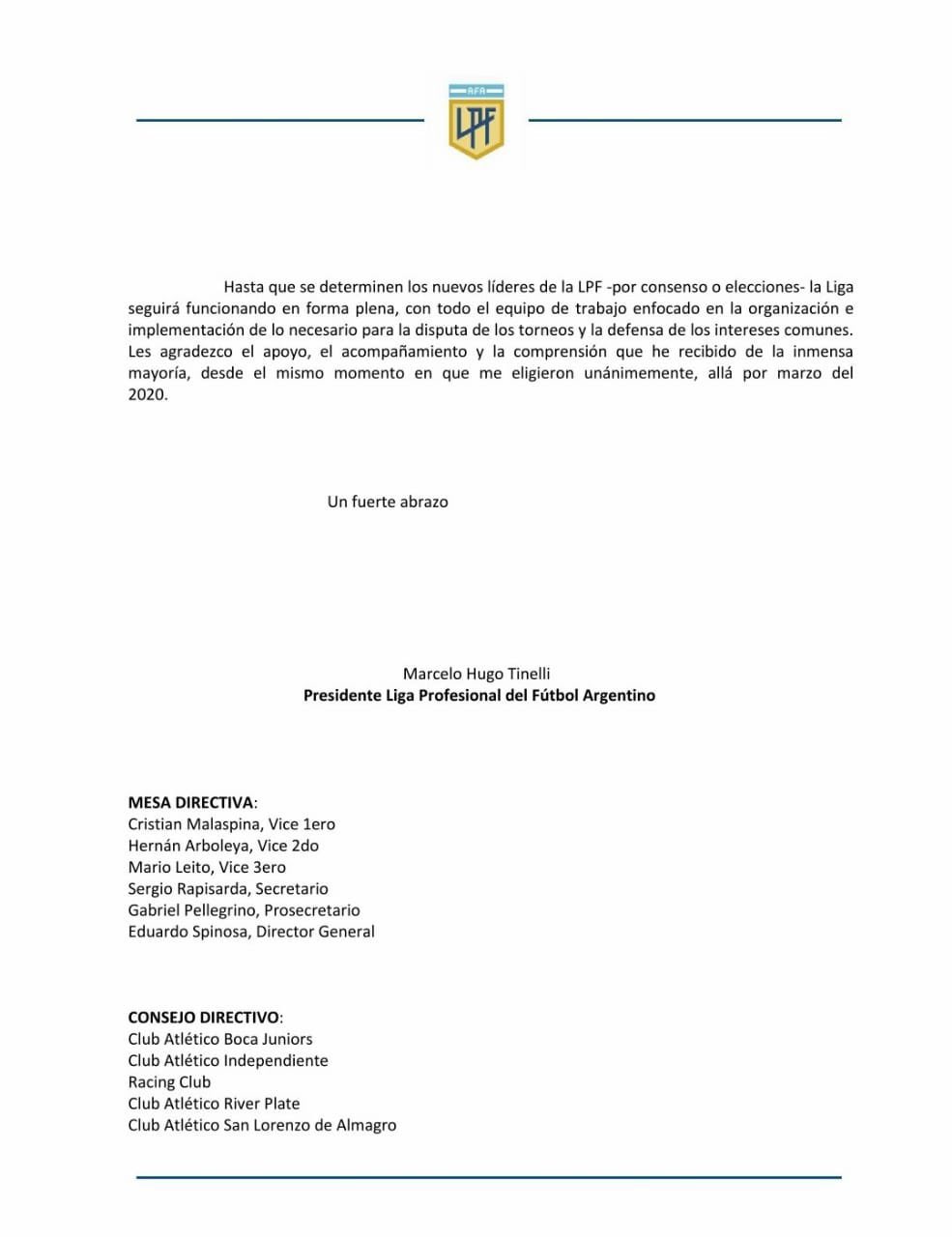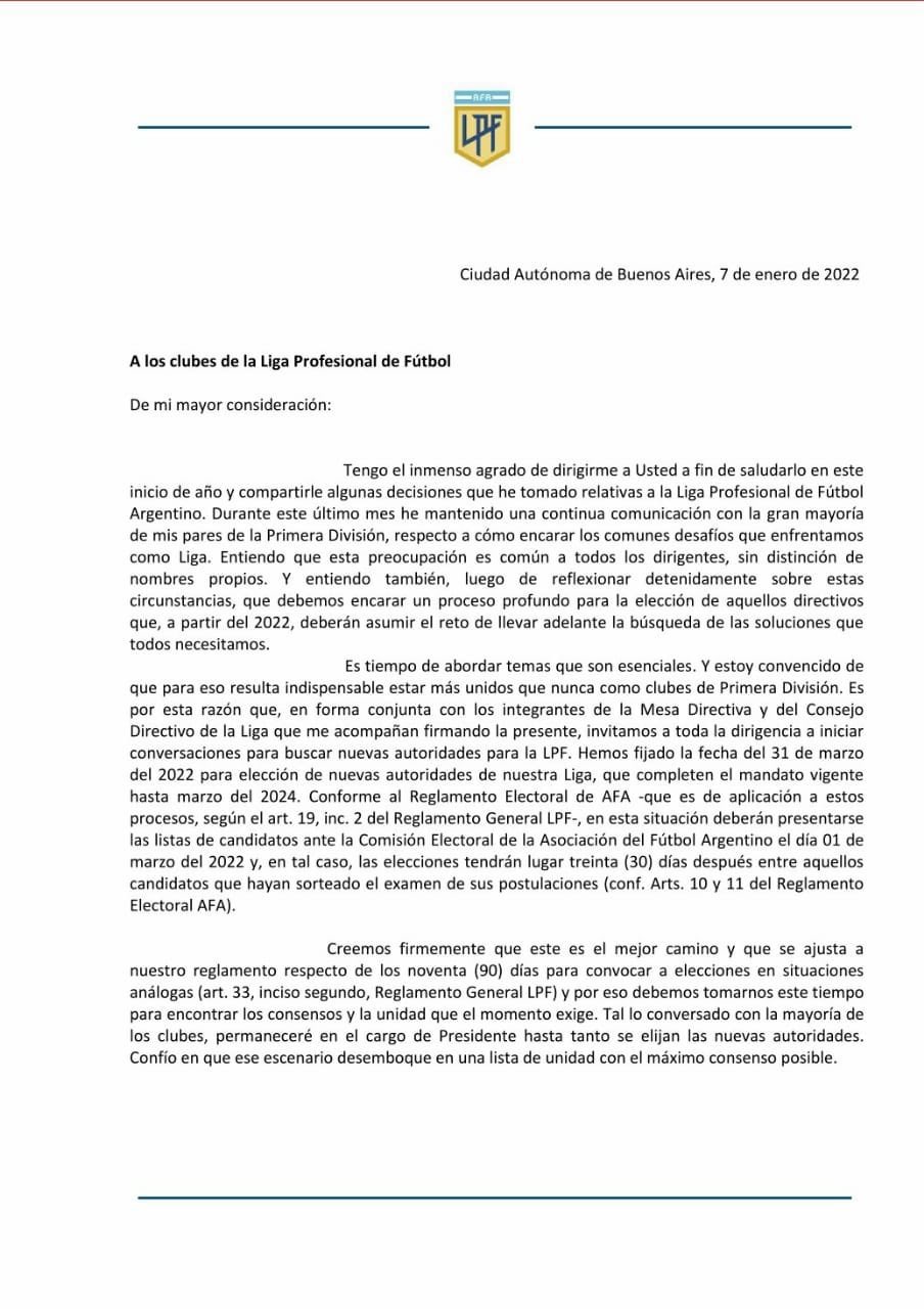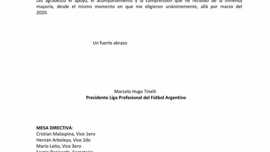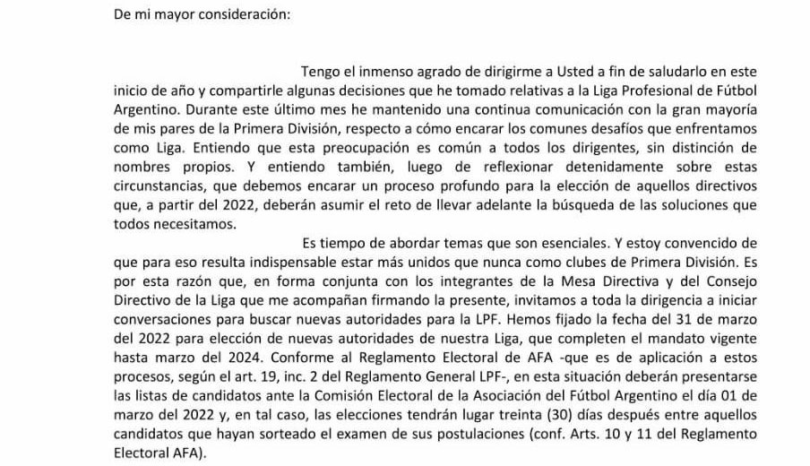«Es tiempo de abordar temas esenciales. Y estoy convencido que para ello resulta indispensable estar más unidos que nunca como clubes de Primera División. Es por esta razón que, junto con los integrantes de la Mesa Directiva y del Consejo Directivo de la Liga, que acompañan esta nota firmando, invitamos a toda la dirigencia a iniciar conversaciones para buscar nuevas autoridades de la LPF», introduce la nota.