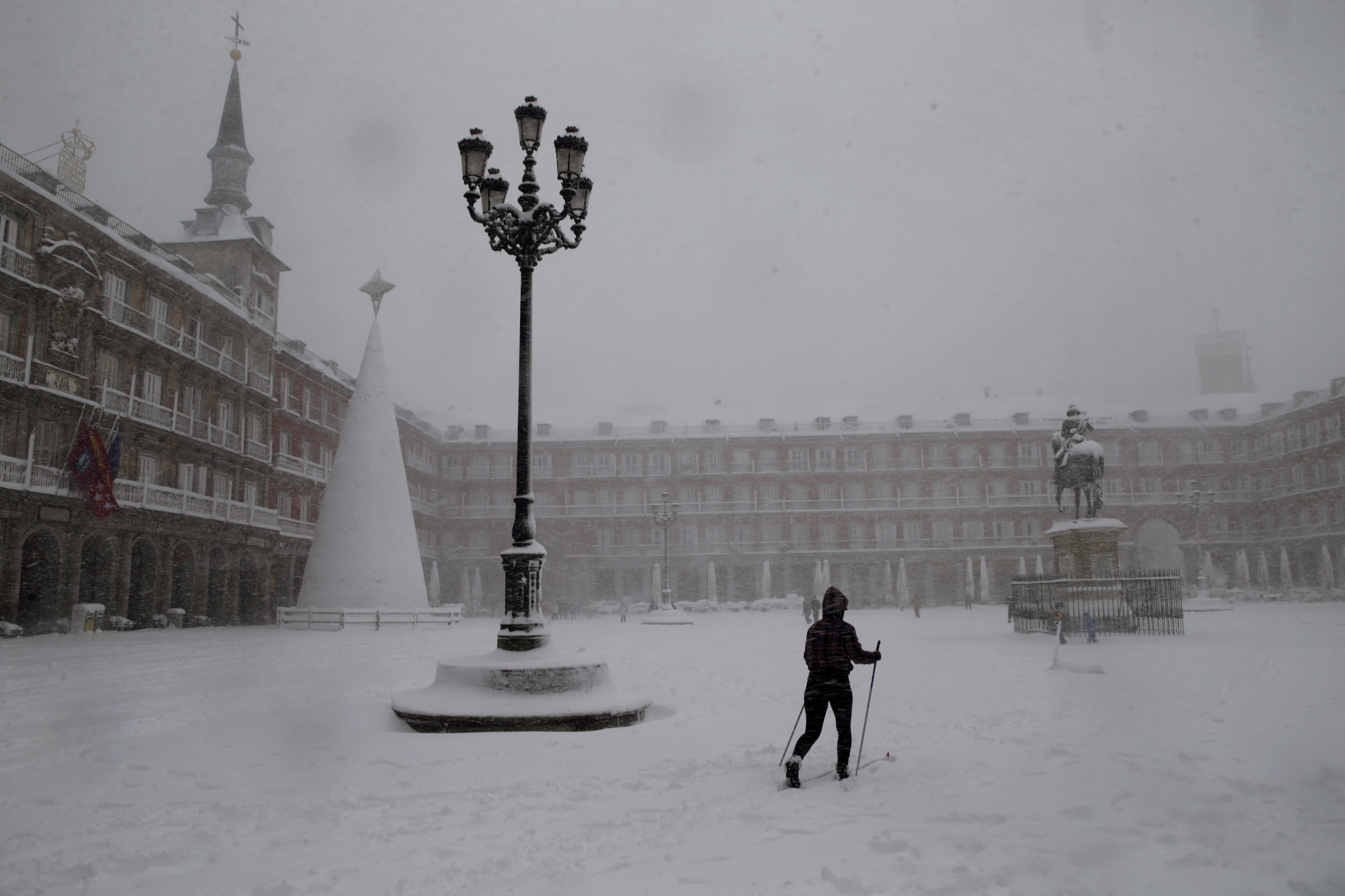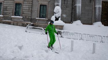 La nevada también dejó imágenes insólitas para muchos madrileños. Algunos se atrevieron a salir a la calle con sus equipos de esquí y recorrieron la principal avenida comercial de la capital, la Gran Vía, y la Puerta del Sol, y hubo hasta un trineo tirado por perros, según videos que circulaban por redes sociales.