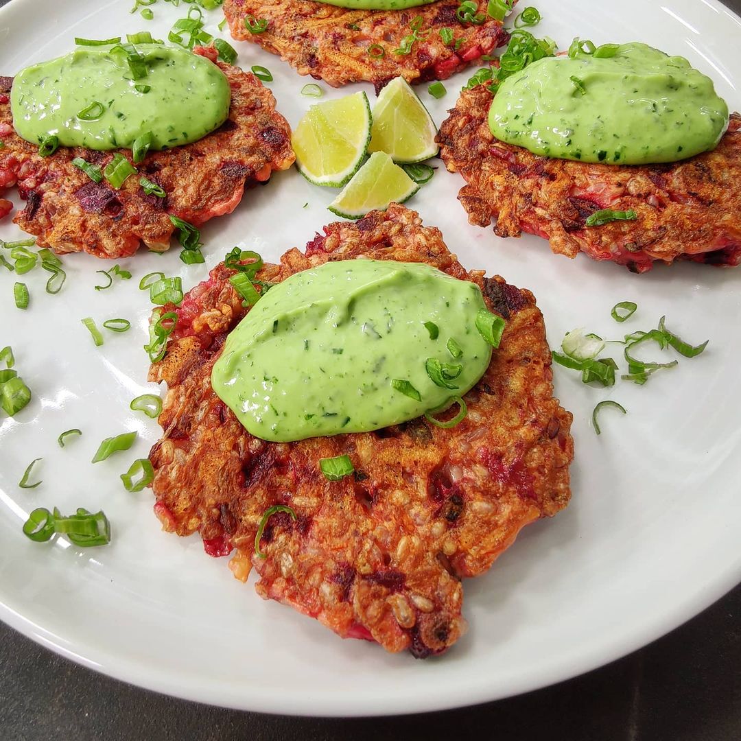 Torrejas de arroz integral y remolacha con mayonesa de perejil