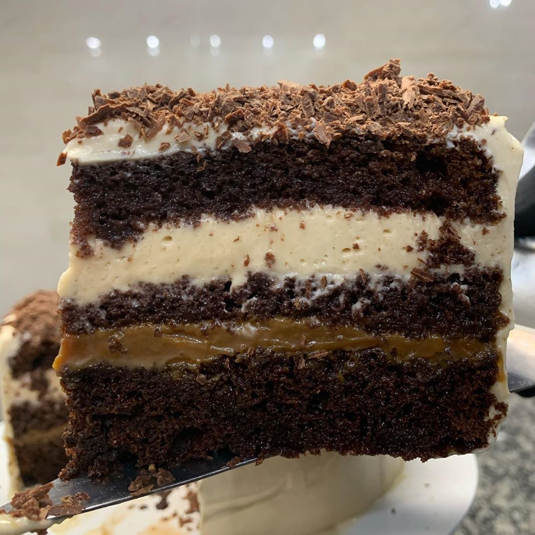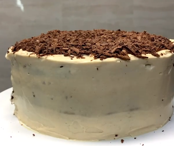 El armado consiste en cortar el bizcocho en 3 capas, humectar con el almíbar y rellenar: una capa de dulce de leche, una de crema de amarula y alisar con la crema de amarula. Arriba usé chocolate rallado.