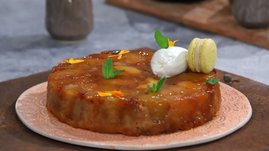 Verter por arriba de las manzanas. Hornear 20 minutos a 180° C. Enfriar levemente la base para asegurar desmoldar la torta en el momento de darla vuelta sobre un plato de presentación.